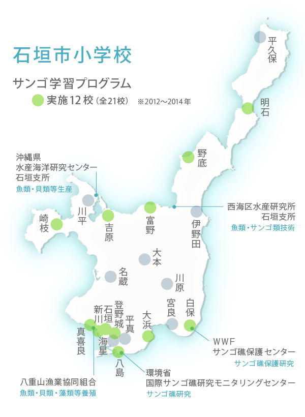 わくわくサンゴ石垣島プロジェクトは、“石垣島をサンゴとサンゴ礁について学び、ふれ合うことができる島にすること”をビジョンとした島の活動です。沖縄県石垣市には、小学校が21校あり、全児童数は約3000名。まずは、2014年までにサンゴ学習を全小学校へ提供することを目指し、各地域の学校で実施可能なプログラムと体制作りを行っています。